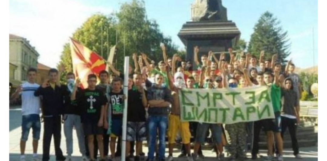 Vdekje për shqiptarët” është pankarta që e mbajnë të rinj maqedonas, të cilët ditëve të fundit janë pjesë e protestave kundër gjuhës shqipe dhe kundër kërkesave të partive shqiptare, informon INA. MPB duhet të ndërmarrë masa kundër këtij grupi që shprehin gjuhën e urrejtjes dhe frymën shoveniste. Parullat e tilla janë hasur edhe në disa qytete të tjera gjatë protestave të fundit, por edhe në stadiumet e futbollit.