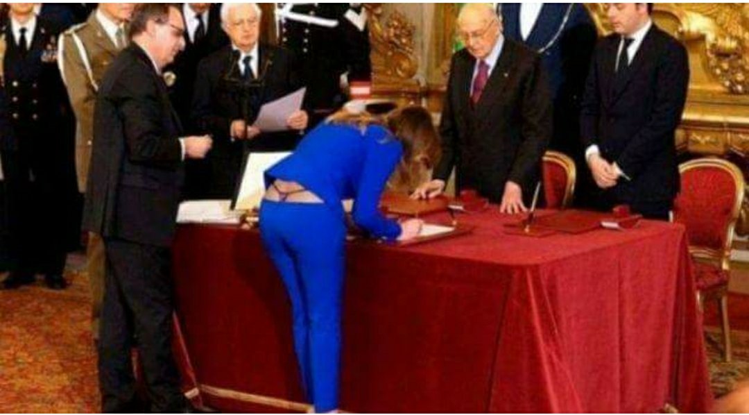 Një foto jo e zakonshme po bën xhiron e rrjetit së fundmi. Një foto jo e zakonshme po bën xhiron e rrjetit së fundmi. Fjala është për ministren italiane të Reformës, Maria Elena Boschi. Një foto e saj teksa ajo nënshkruan, ku dalin në pah edhe tangat e saj, është kritikuar nga të gjithë.
