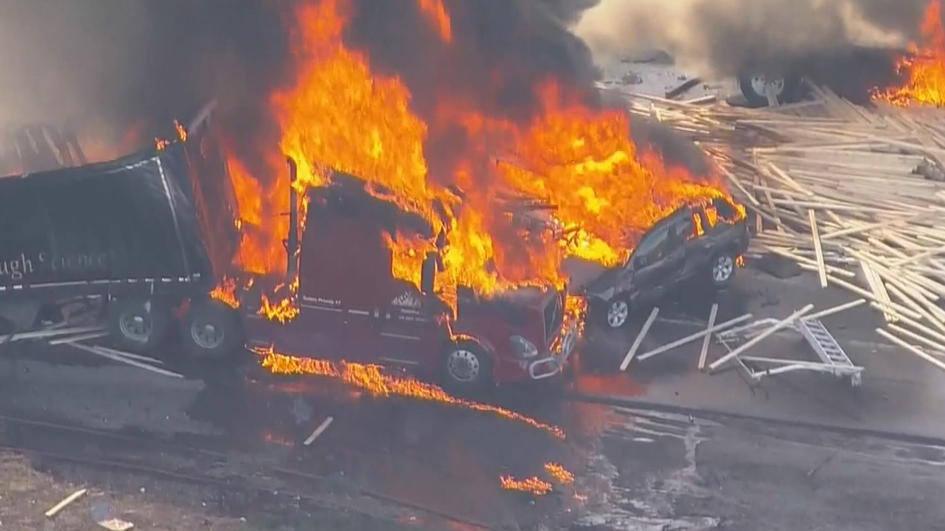 Pamje nga vendi i ngjarjes tregojnë zjarrin teksa ngrihet nga poshtë dhe rreth mbikalimit në autostradë, dhe shtëllunga të mëdha tymi të zi.