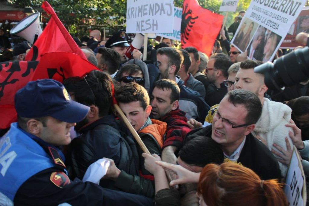 Lëvizja Vetëvendosja ka organizuar një protestë në bulevardin “Dëshmorët e Kombit” kundër ardhjes së Presidentit serb, Alekandër Vuçiç në Tiranë. Protestuesit kanë tentuar të thyejnë kordonin e policisë dhe ka shkruar deri në përplasje fizike. Policia iu ka bërë me dije protestuesve të Lëvizjes Vetëvendosja se tubimi i tyre është i paligjshëm. Ndaj tyre madje është ushtruar edhe dhunë sikundër shihet në këto foto që sjell LAPSI.al Po kështu dy prej protestuesve janë arrestuar nga policia.