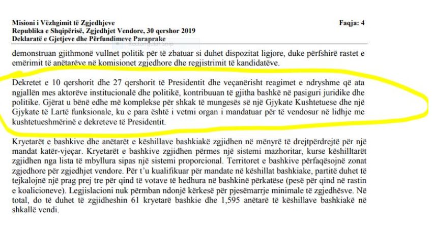 Një pikë tjetër ndoshta më e forta është ajo që ka ngjallur debatin publik në Shqipëri: a janë ap jo të ligjshme dekretet presidenciale për anullimin e 30 qershorit? Raporti i ODHIR mban të njëjtin qëndrim si Ilir Meta se ato dekrete mund ti gjykojë vetëm gjykata kushtetuese dhe jo Kolegji Zgjedhor: