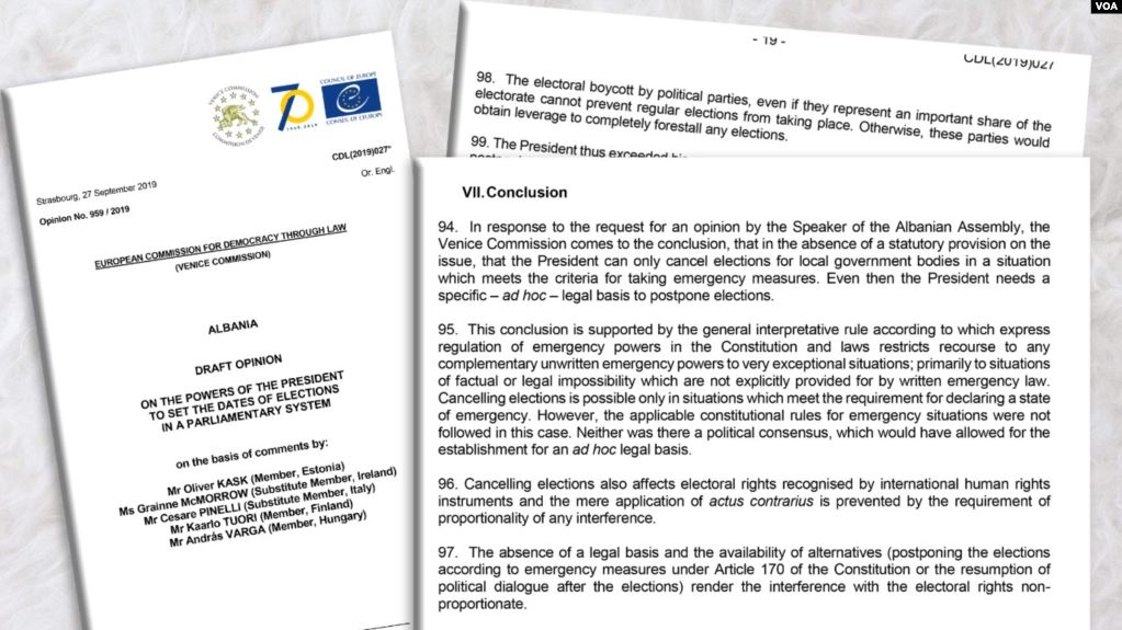 Komisioni i Venecias vlerëson se Presidenti Ilir Meta ka vepruar në tejkalim të kompetencave të veta kushtetuese ndërsa vendosi të anulojë 30 qershorin si datë të zgjedhjeve vendore. Në draft opinionin e tij, një kopje të të cilit e ka siguruar të plotë “Zëri i Amerikës”, Komisioni megjithatë vëren se sipas tij, nuk janë kushtet për të vërtetuar një shkelje serioze që do të çonte në shkarkimin e tij.