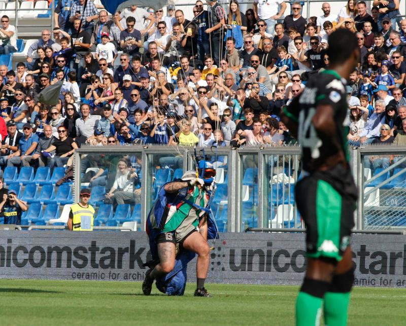 Prokuroria e Reggio Emilia ka nisur procedurat për ndalimin e marrjes pjesë në aktivitete sportive kundër parashutistit, që të dielën e kaluar zbriti në fushën e Mapei Stadium, gjatë ndeshjes së Serie A mes Sassuolo e Inter. Protagonist i kësaj ndërhyrje jashtë programit ishte një 36 vjecar, rezident milanez, që ishte nisur me veshjen speciale nga aeroporti i afërt “Campovolo”. Kundër tij është një denoncim për invazion fushe në kohën kur “aksioni i ndërmarrë mund të rrezikonte rëndë publikun e shumtë prezent në stadium dhe lojtarët në fushë”, ashtu si lexohet në komunikatën e lëshuar nga Policia. Parashutisti ekspert, me më shumë se 900 hedhje e 10 vjet eksperiencë, ishte justifikuar, duke treguar për shtypin lokal se ka patur “një problem të lehtë me fluturimin” pas hedhjes e se në atë pikë zgjidhi një “ulje emergjence” edhe pse nga lart “nuk e kishte kuptuar se ai kuadrat jeshil ishte një stadium”.