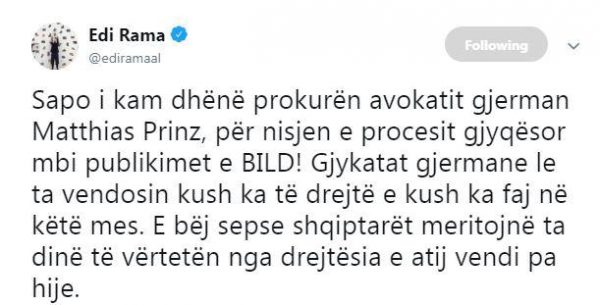 Përgjigja jonë është se e gjithë kjo është pa sens, e pakuptimtë. Nuk ka asgjë, asgjë me të vërtetë. Asnjë procedurë, asnjë padi, asgjë… Avokati i kryeminstrit duhet të kishte shkuar në gjykatë, por nuk ka shkuar, e as ne nuk jemi thirrur. Nuk ka asgjë ndaj meje dhe as ‘Bild’-it në gjykatë apo ndokund tjetër” – tha Tiede.