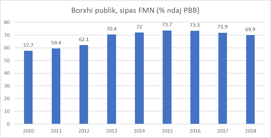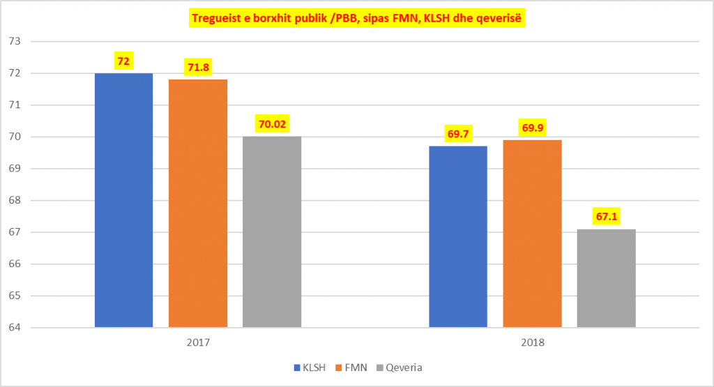 Nëse në 2013 shifra e borxhit sipas FMN ishte 70.1% në vitin 2018 ajo ka zbritur vetëm me 0.2% (tabelat krahasuese poshte). Madje sipas opozitës pot ë futeshin edhe detyrimet e fshehura prej 2.2 miliardë eurosh të PPP-ve korruptive ai mund të llogaritej edhe 81%.