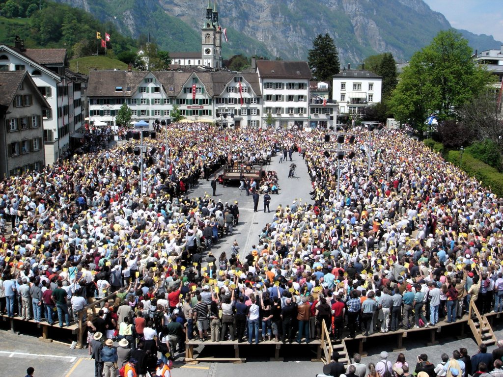 PS Në foto, Asambleja e Kantonit të Glarusit (popullsia rreth 40.000), në vitin 2006, që vendosi ndryshimin e hartës territoriale dhe shkrirjen e 25 bashkive në 3 bashki.