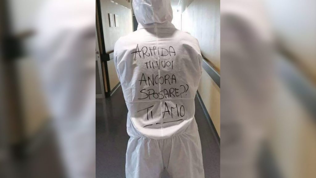 Johnny Fasulo, një infermier në kujdesin intensiv Covid të një spitalit në Vimercate në Itali, ka përdorur kostumin mbrojtës që ai vesh gjatë turnit, për të propozuar për martesë të dashurën e tij Armida Cozzolino, një infermiere tjetër në këtë spital.