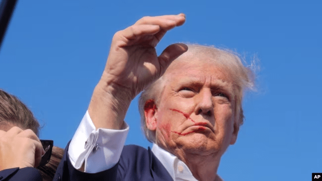 Turma brohoriti ndërsa ai u ngrit përsëri duke ngritur edhe grushtin lart në drejtim të turmës që bërtiste: SHBA, SHBA.