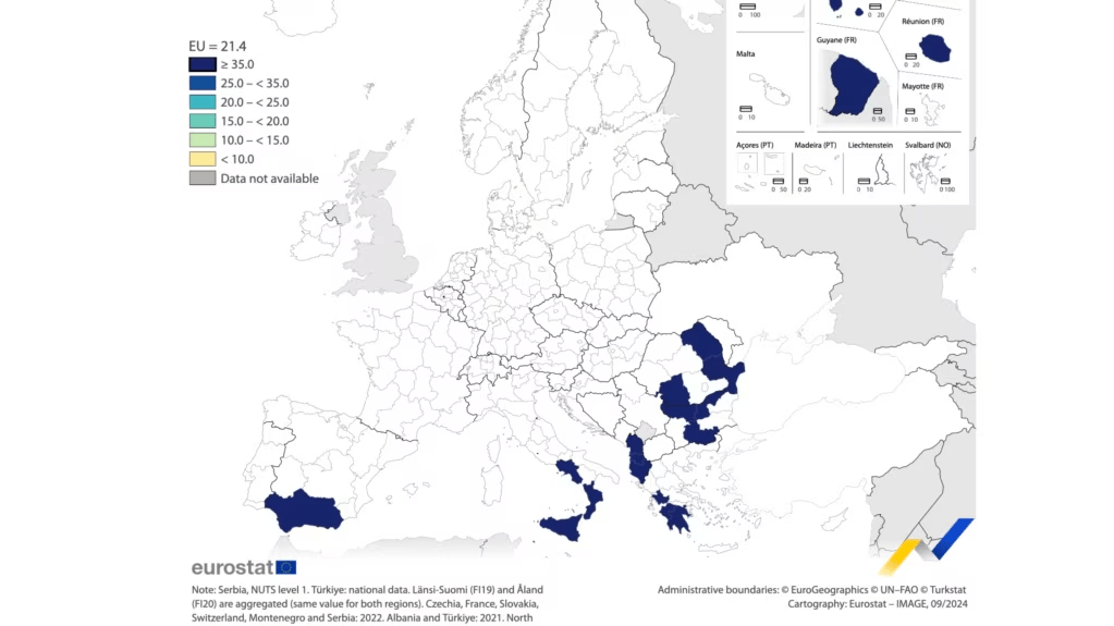 Nivelet më të larta të popullsisë në rrezik varfërie, sipas Eurostat u regjistruan në rajonet më të largëta franceze, në Italinë jugore dhe në rajonet rurale rumune.
