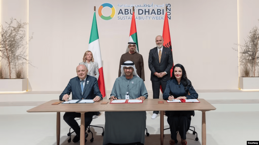 Në praninë e presidentit të Emirateve, Mohamed bin Zayed si dhe kryeministrave Edi Rama e Giorgia Meloni, marrëveshja tre palëshe u firmos nga ministrja shqiptare e Infrastrukturës dhe Energjisë Belinda Balluku, ministri italian i Mjedisit Gilberto Pichetto dhe Sultan bin Ahmed Al Jaber, ministër i Industrisë dhe Teknologjisë së avancuar i Emirateve