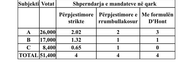 Le të supozojmë se një qark ka 4 mandate parlamentare dhe në të garojnë 3 subjekte zgjedhore.