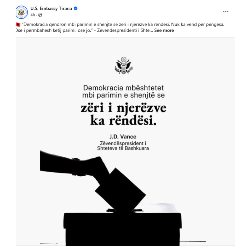 Ambasada e SHBA ndau sot në rrjetet sociale një citim nga zëvendëspresidenti JD Vance, i shoqëruar nga një dorë që hedh një fletë votimi në një kuti. Si mund të kontekstualizohet apo interpretohet kjo deklaratë kur ka mbetur vetëm një javë para zgjedhjeve parlamentare të 11 majit?