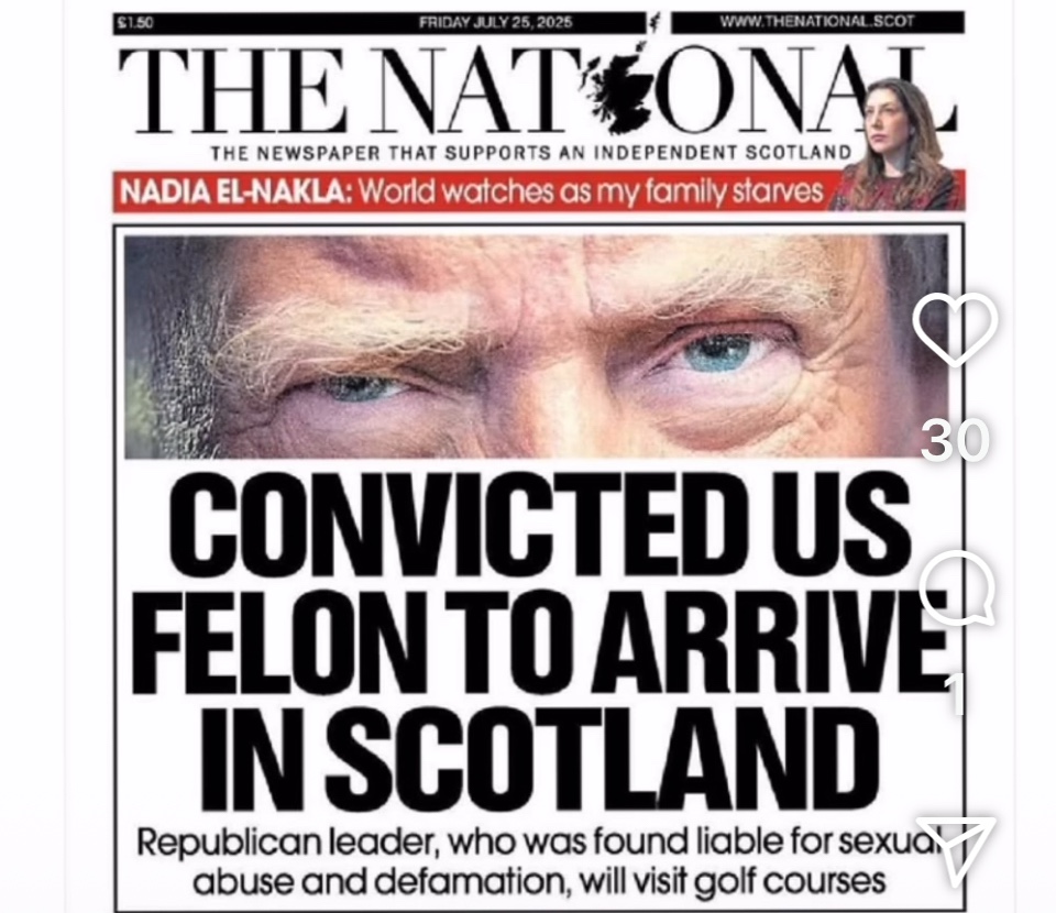 Jashtë aeroportit, një grup i parë protestuesish ishin mbledhur për të shprehur kundërshtinë e tyre ndaj vizitës. Disa prej tyre mbanin kapele të kuqe, të ngjashme me ato të mbështetësve amerikanë të lëvizjes MAGA (Make America Great Again), por me një ndryshim domethënës: fjalët “Skocia është tashmë e madhe” të shkruara mbi to. Kjo shprehje ironike shërben si një shenjë refuzimi ndaj fokusit të presidentit-manjat te promovimi i bizneseve të tij private në kombin verior të Mbretërisë së Bashkuar.