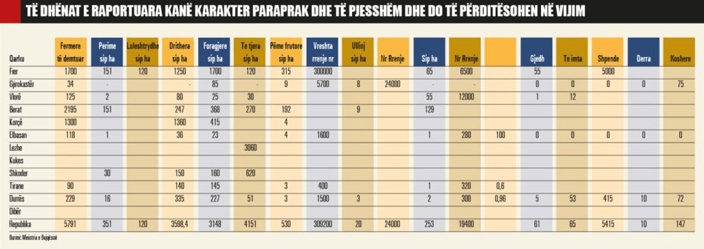 Në nivele specifike drithërat, të kultivuara në 3 598 hektarë, kanë humbur vlera që llogariten nga 2.88 deri në 4.32 miliardë lekë.