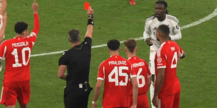 Momenti që ndryshoi vërtet Bayern Munich–Real Madrid vjen në fund, kur ndeshja duket se po shkonte drejt një përfundimi ende plotësisht të hapur. Në Allianz Arena, me Real Madrid në avantazh 3-2 atë natë dhe çështjen e kualifikimit ende në ekuilibër pas fitores 2-1 të Bayern në ndeshjen e parë, Eduardo Camavinga merr kartonin e dytë të verdhë për vonesë në rifillimin e lojës pas një faulli ndaj Harry Kane. Mesfushori francez, i futur në minutën e 62’ dhe tashmë i ndëshkuar më parë, e mban topin për disa metra dhe ndëshkohet nga Slavko Vincic.
